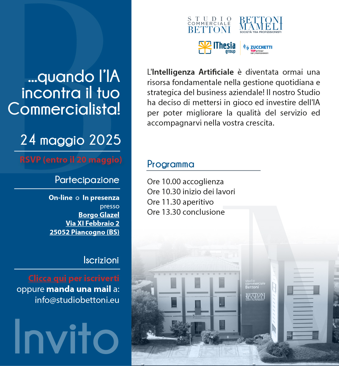 L’Intelligenza Artificiale è diventata ormai una risorsa fondamentale nella gestione quotidiana e strategica del business aziendale! Il nostro Studio ha deciso di mettersi in gioco ed investire dell’IA per poter migliorare la qualità del servizio ed accompagnarvi nella vostra crescita.
