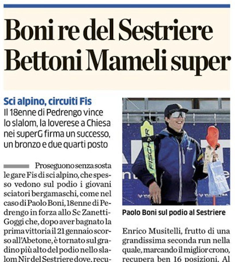 “Sci alpino, circuiti Fis 18enne di Pedrengo vince lo slalom, la loverese a Chiesa nei superG firma un successo, un bronzo e due quarti posto”
